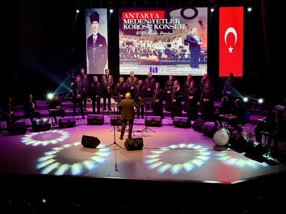 Antakya Medeniyetler Korosu, Trabzon’da konser verdi. Şef Yılmaz Özfırat yönetimindeki koro, Karadeniz Teknik Üniversitesi Atatürk Kültür Merkezi’nde Trabzon İnşaat Mühendisleri Odasınca organize edilen konserde sahne aldı.