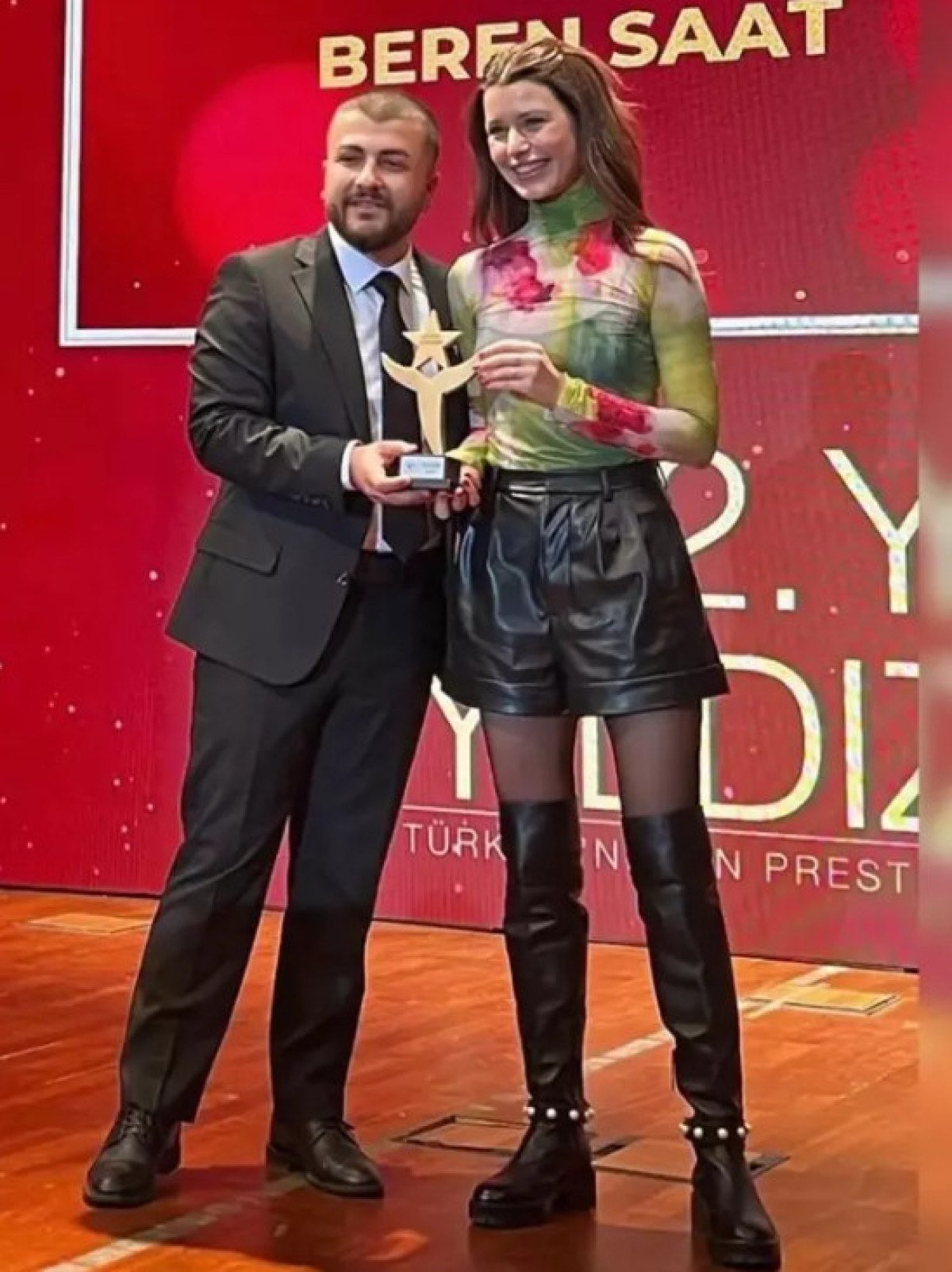 Ödülünü “İstanbul İçin Son Çağrı” filmiyle alan Beren Saat, kıyafet seçimiyle de dikkat çekti. Deri şortu ve çizmeleriyle klasik bir bluzu kombinleyen Saat’in bu tarzı sosyal medyayı ikiye böldü.