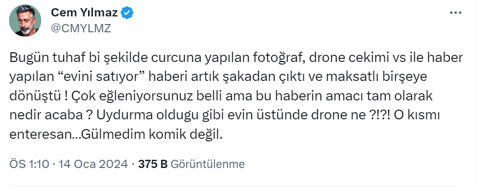 X hesabından açıklamaya yapan Yılmaz, “Bugün tuhaf bi şekilde curcuna yapılan fotoğraf, drone cekimi vs ile haber yapılan ‘evini satıyor’ haberi artık şakadan çıktı ve maksatlı bir şeye dönüştü'” ifadelerini kullandı.