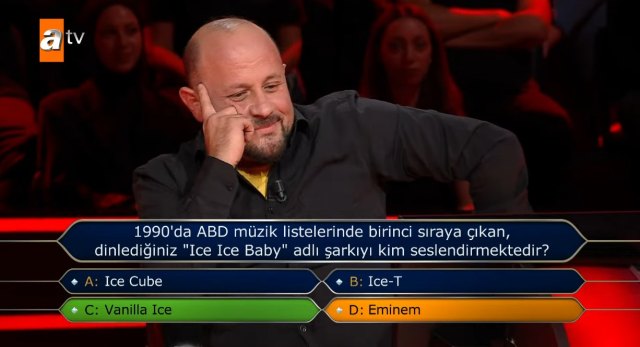 Heyecanı ve enerjisiyle dikkat çeken Bayram, 30 bin TL’lik soruya kadar geldi. Yarışmacıya 30 bin TL değerindeki 6. soruda “1990’da ABD müzik listelerinde birinci sıraya çıkan dinlediğiniz ‘Ice Ice Baby’ adlı şarkıyı kim seslendirmektedir?” soruldu. Doğru cevabın “Vanilla Ice” olduğu soruya “Eminem” cevabını veren Murat Yaşar Bayram elendi. Elenince büyük bir şaşkınlık yaşayan yarışmacının hiç susmaması Kenan İmirzalıoğlu’nu da şaşkına çevirdi.