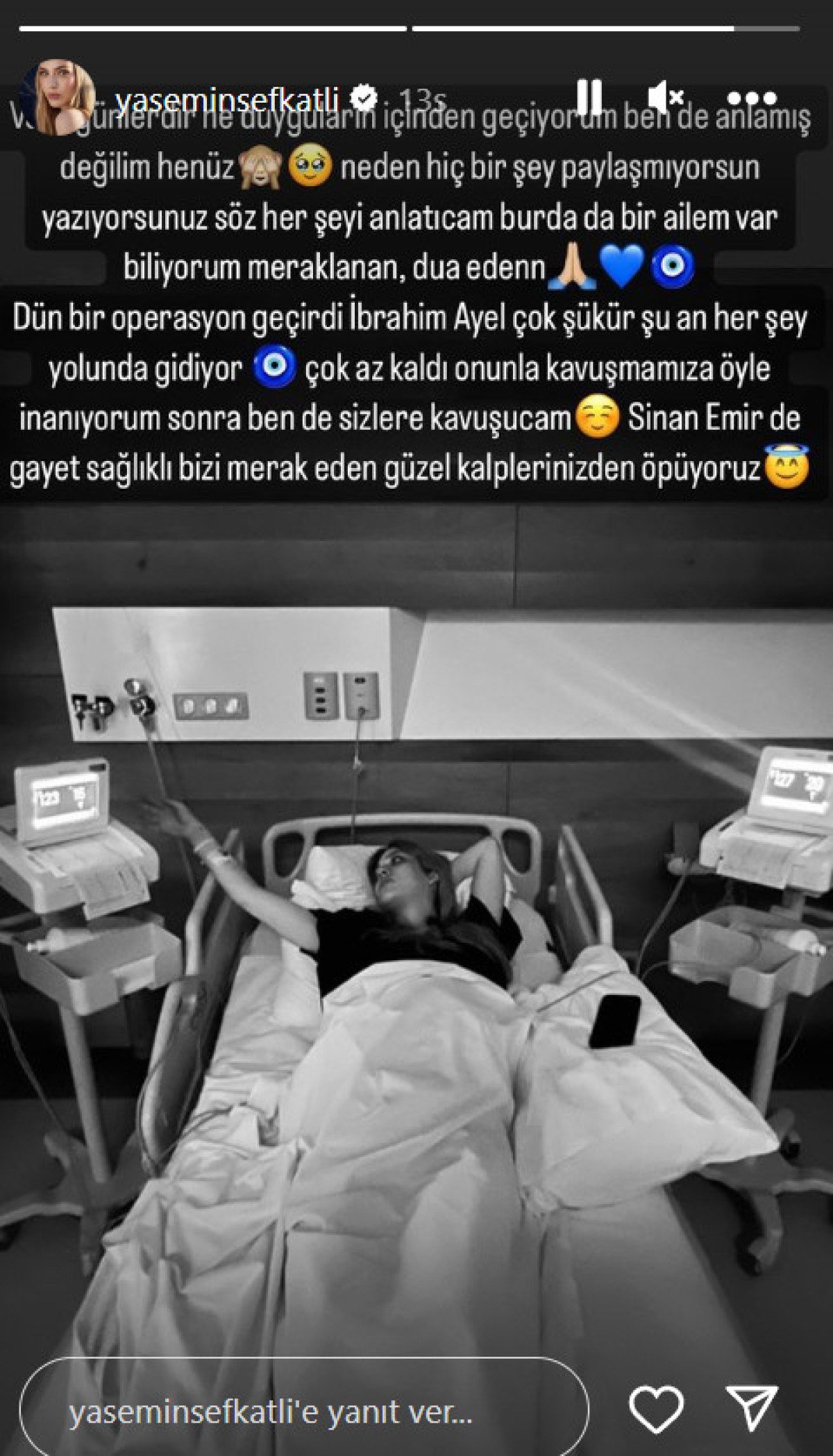 Günlerdir ne duyguların içinden geçiyorum, ben de anlamış değilim henüz. ‘Neden hiçbir şey paylaşmıyorsun?’ yazıyorsunuz, söz her şeyi anlatacağım… Burada da bir ailem var biliyorum, meraklanan, dua eden herkese teşekkürler. Dün bir operasyon geçirdi İbrahim Ayel, çok şükür şu an her şey yolunda gidiyor. Çok az kaldı onunla kavuşmamıza, öyle inanıyorum. Sinan Emir gayet sağlıklı. Bizi merak eden güzel kalplerinizden öpüyoruz.