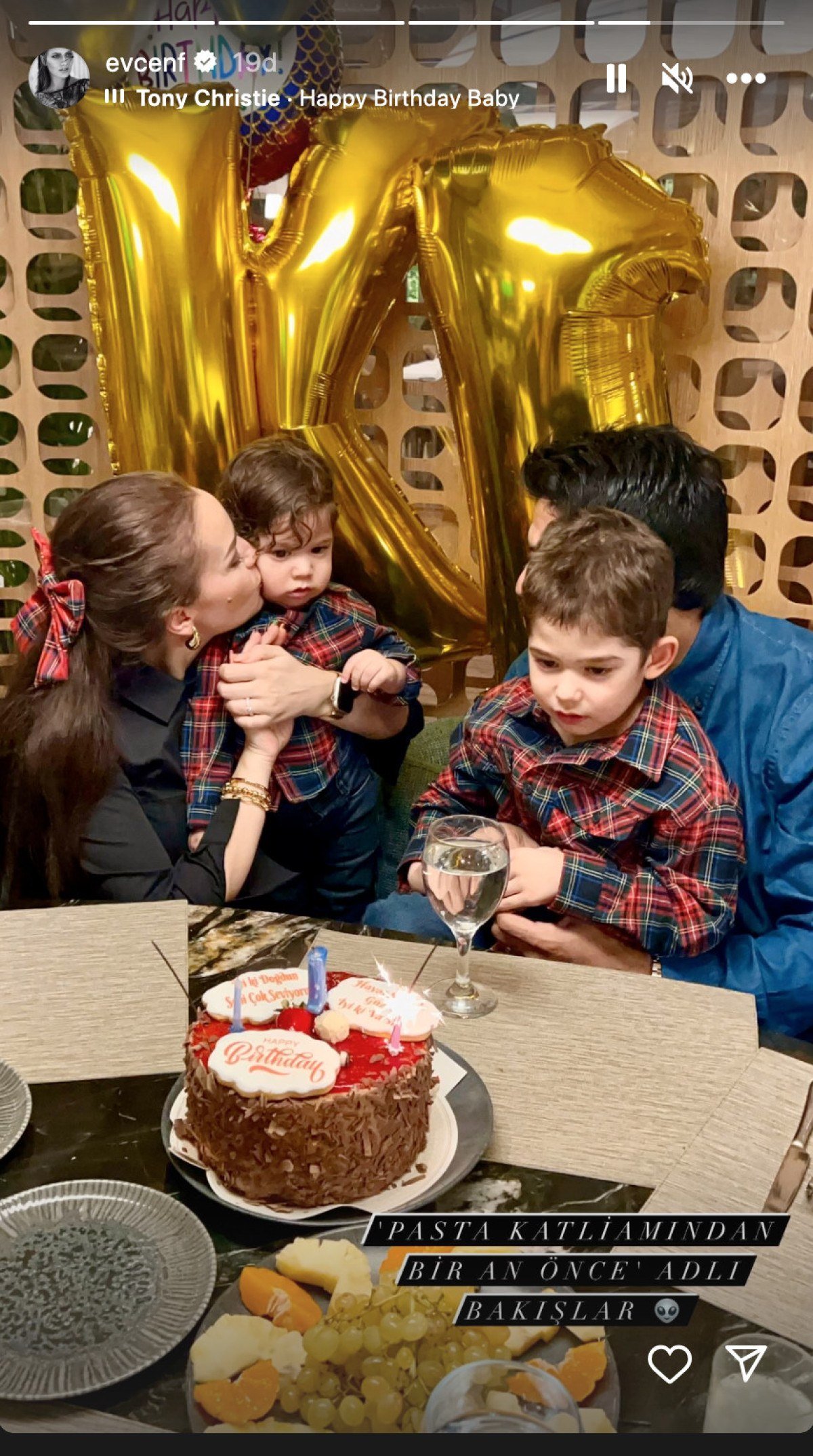 Oğlullarına aynı şeyleri giydiren Evcen, pasta üflerken ailecek çektirdikleri kareleri de sosyal medya hesabından yayınladı.