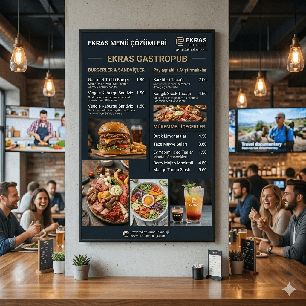 Dijital menü board sistemleri, kağıt israfını önleyerek çevreye duyarlı işletmelere katkı sağlar. Ekras Teknoloji, enerji verimli paneller ve güncel teknolojilerle bu alana öncülük eder. Showroom’umuz, sektördeki son trendleri yakından takip eden bir inovasyon merkezi haline gelmiştir. Stoktan hızlı teslim sayesinde işletmeler, rekabetin gerisinde kalmaz. Menü board çözümleri, gelecekte yapay zeka destekli kişiselleştirme özellikleriyle daha da gelişecektir.