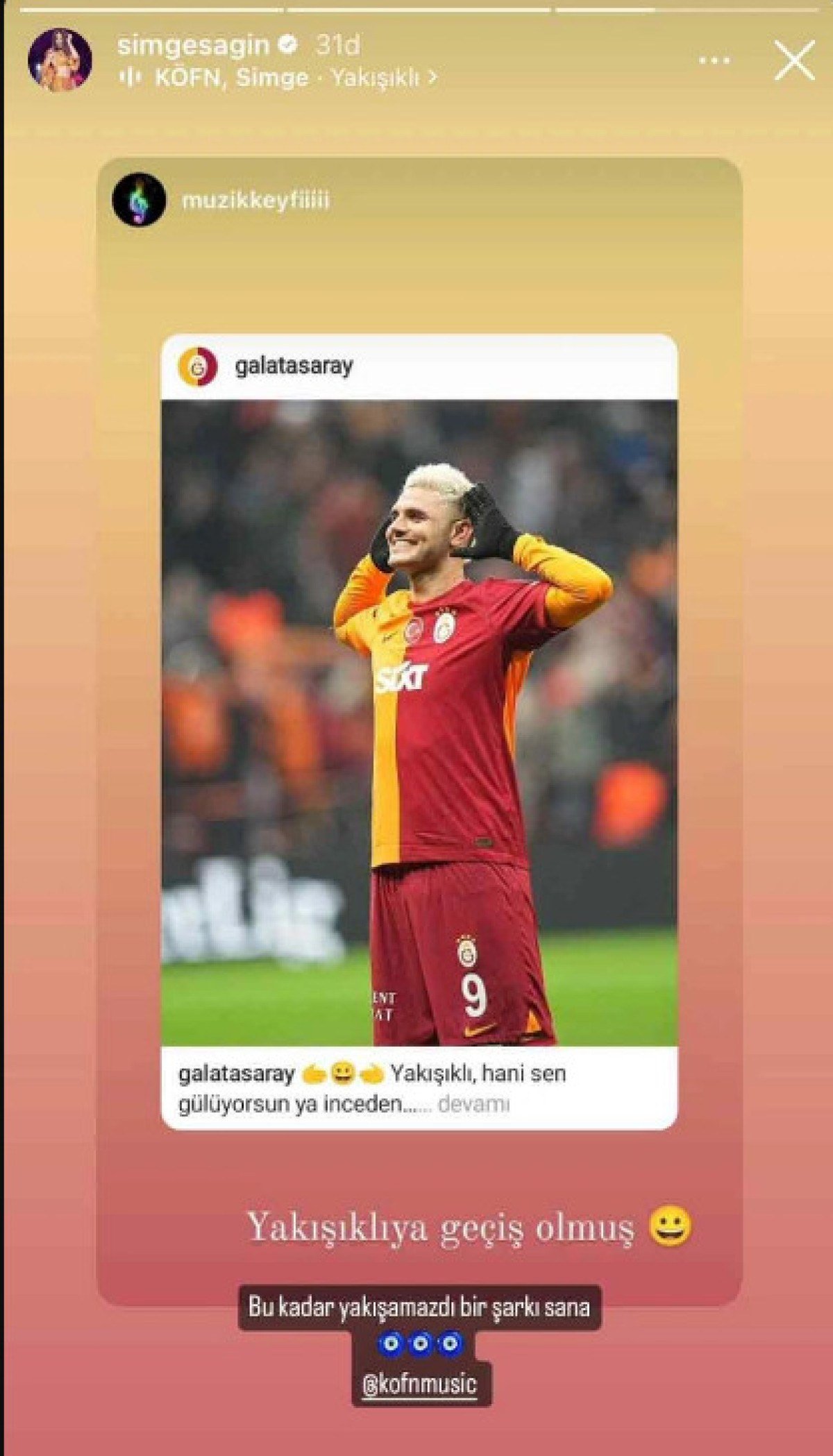 resmi hesabı, “Aşkın Olayım” ile özdeşleşen Icardi’nin dönüşünü, Simge’nin yeni şarkısı “Yakışıklı” ile kutladı. Paylaşımda şarkının dizeleri olan “Yakışıklı, hani sen gülüyorsun ya inceden” sözlerine yer verildi.