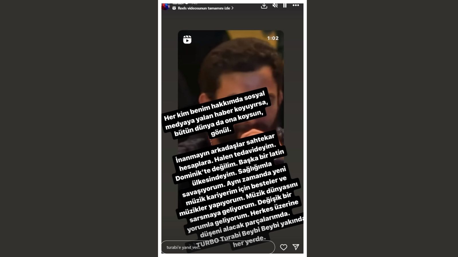Konuyla ilgili Instagram hesabından açıklamalarda bulunan Survivor Turabi, “Her kim benim hakkımda sosyal medyaya yalan haber koyuyorsa bütün dünya dünya da ona k.ysun. İnanmayın arkadaşlar sahtekar hesaplara halen daha tedavim devam ediyor. Dominik’te değilim. Başka bir Latin ülkesindeyim. Sağlığımla savaşıyorum. Aynı zamanda yeni müzik kariyerim için besteler ve müzikler yapıyorum. Müzik dünyasını sarsmaya geliyorum. Değişik bir yorumla geliyorum. Herkes üzerine düşeni alacak parçalarım da… “ diyerek hakkındaki spekülasyonlara son verdi. Turabi Çamkıran sosyal medyadan ilk şarkısının adını da duyurdu. Beybi Beybi isimli şarkısıyla çıkış yapacak sanatçı, önümüzdeki günlerde kamera karşısına geçecek.