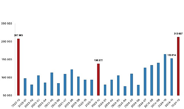 Türkiye genelinde konut satışları Aralık ayında bir önceki yılın aynı ayına göre %53,4 oranında artarak 212 bin 637 oldu.