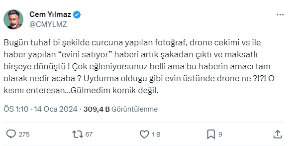 “Evini satıyor” iddialarına sinirlenen Yılmaz sosyal medya hesabından bir açıklama yaptı. Başarılı komedyen “Bugün tuhaf bir şekilde curcuna yapılan fotoğraf, drone cekimi vs ile haber yapılan “evini satıyor” haberi artık şakadan çıktı ve maksatlı bir şeye dönüştü ! Çok eğleniyorsunuz belli ama bu haberin amacı tam olarak nedir acaba ? Uydurma olduğu gibi evin üstünde drone ne? O kısmı enteresan… Gülmedim komik değil.” diyerek haberlerin asılsız olduğunu vurguladı.
